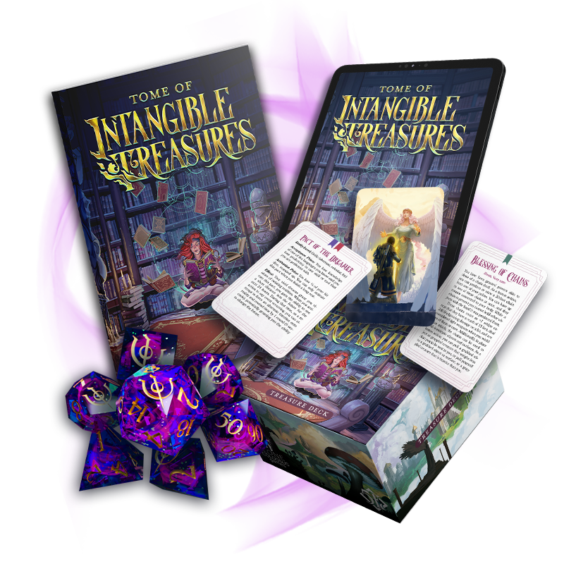 Tome of Intangible Treasures is a compendium of 650+ new ways to provide story-based character rewards and mechanical growth options. Perfect for GMs and players alike, this tome is full of ways to express your characters via boons, blessings, charms, pacts, titles, histories, advanced trainings, and more.